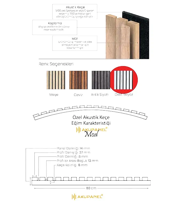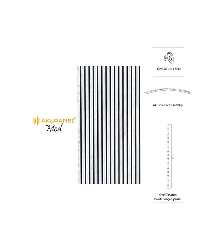 Akupanel, akustik ve dekorasyonu bir araya getiren inovasyon ürünüdür. Bir akupanel ölçülerimiz 60×120 cm dir. Bir akupanel ahşap duvar panelinde 8 adet ahşap profil bulunmaktadır. Ahşap duvar profilleri özel olarak üretilmiş sertifikalı akustik keçe üzerine montajı yapılmıştır. Akupanel’in derinliği 14 mm dir. Oldukça hafif ve eğimli duvarları saracak şekilde esnek bir yapıya sahiptir. Kendin yap deneyimi ile sadece 3 adımda duvara kolayca montajını yapabilirsiniz.