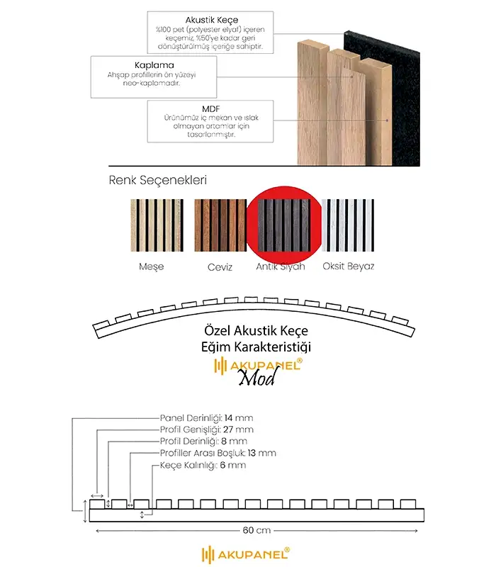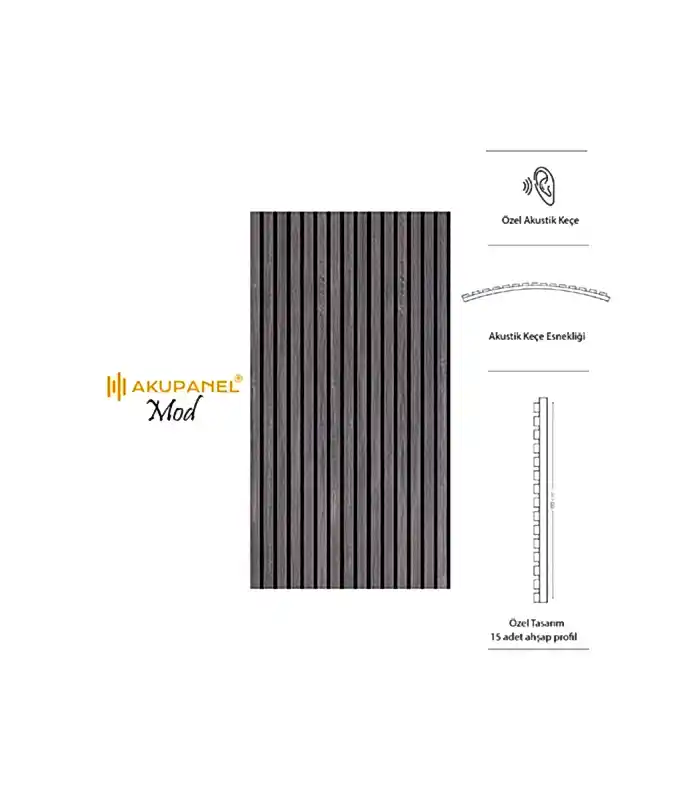 Akupanel, akustik ve dekorasyonu bir araya getiren inovasyon ürünüdür. Bir akupanel ölçülerimiz 60×120 cm dir. Bir akupanel ahşap duvar panelinde 8 adet ahşap profil bulunmaktadır. Ahşap duvar profilleri özel olarak üretilmiş sertifikalı akustik keçe üzerine montajı yapılmıştır. Akupanel’in derinliği 14 mm dir. Oldukça hafif ve eğimli duvarları saracak şekilde esnek bir yapıya sahiptir. Kendin yap deneyimi ile sadece 3 adımda duvara kolayca montajını yapabilirsiniz.
