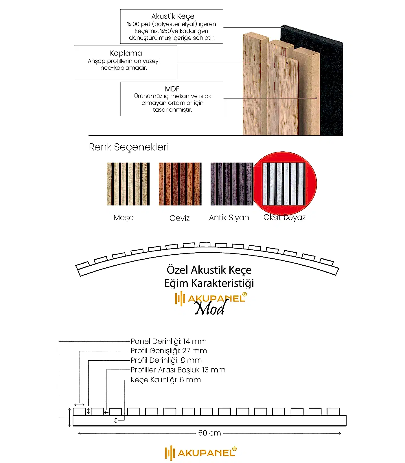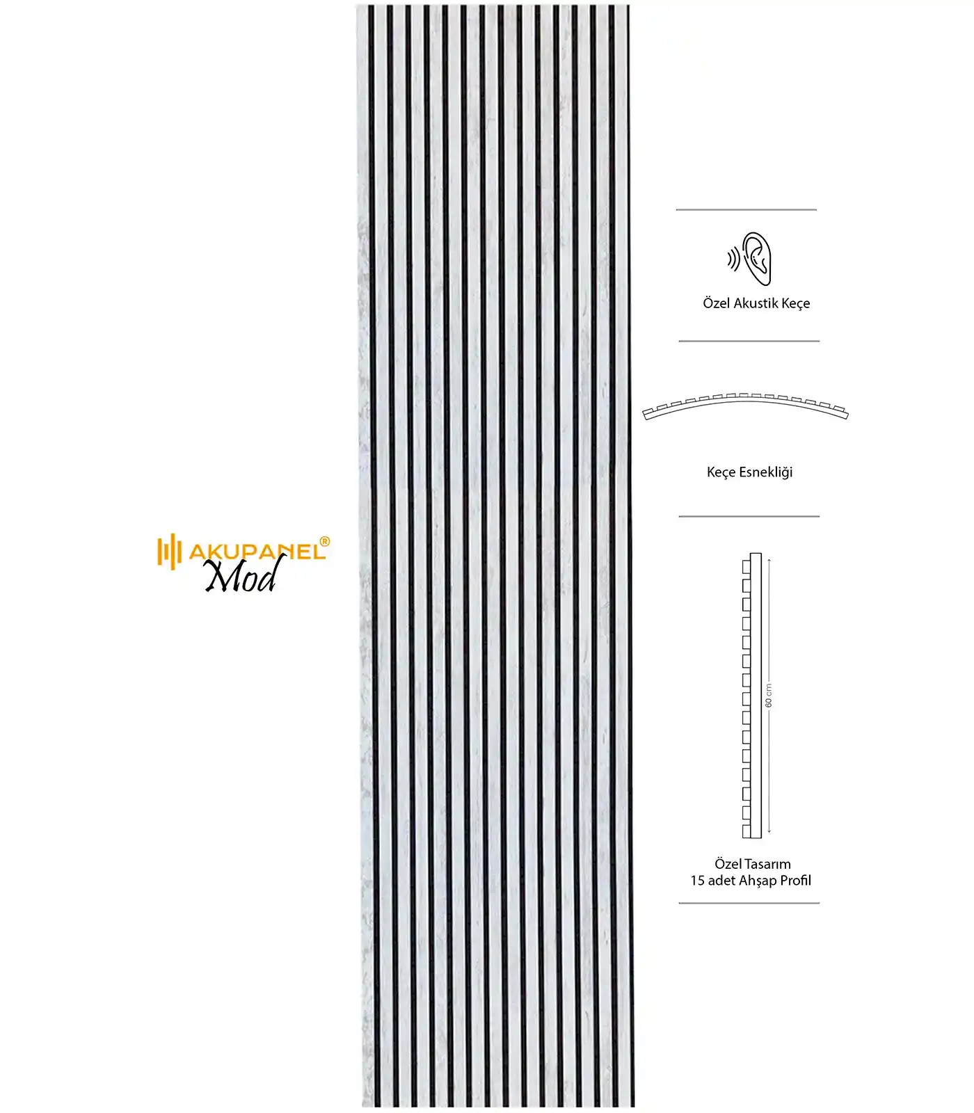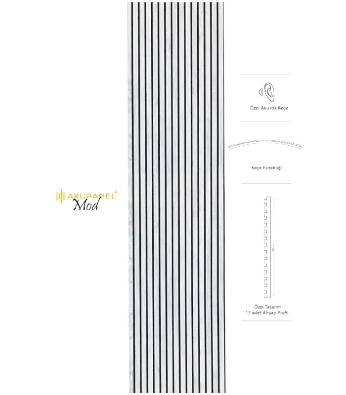 Akupanel, akustik ve dekorasyonu bir araya getiren inovasyon ürünüdür. Bir akupanel ölçülerimiz 60×245 cm dir. Bir akupanel ahşap duvar panelinde 15 adet ahşap profil bulunmaktadır. Ahşap duvar profilleri özel olarak üretilmiş sertifikalı akustik keçe üzerine montajı yapılmıştır. Akupanel’in derinliği 14 mm dir. Oldukça hafif ve eğimli duvarları saracak şekilde esnek bir yapıya sahiptir. Kendin yap deneyimi ile sadece 3 adımda duvara kolayca montajını yapabilirsiniz.