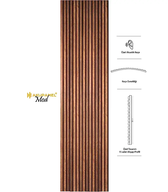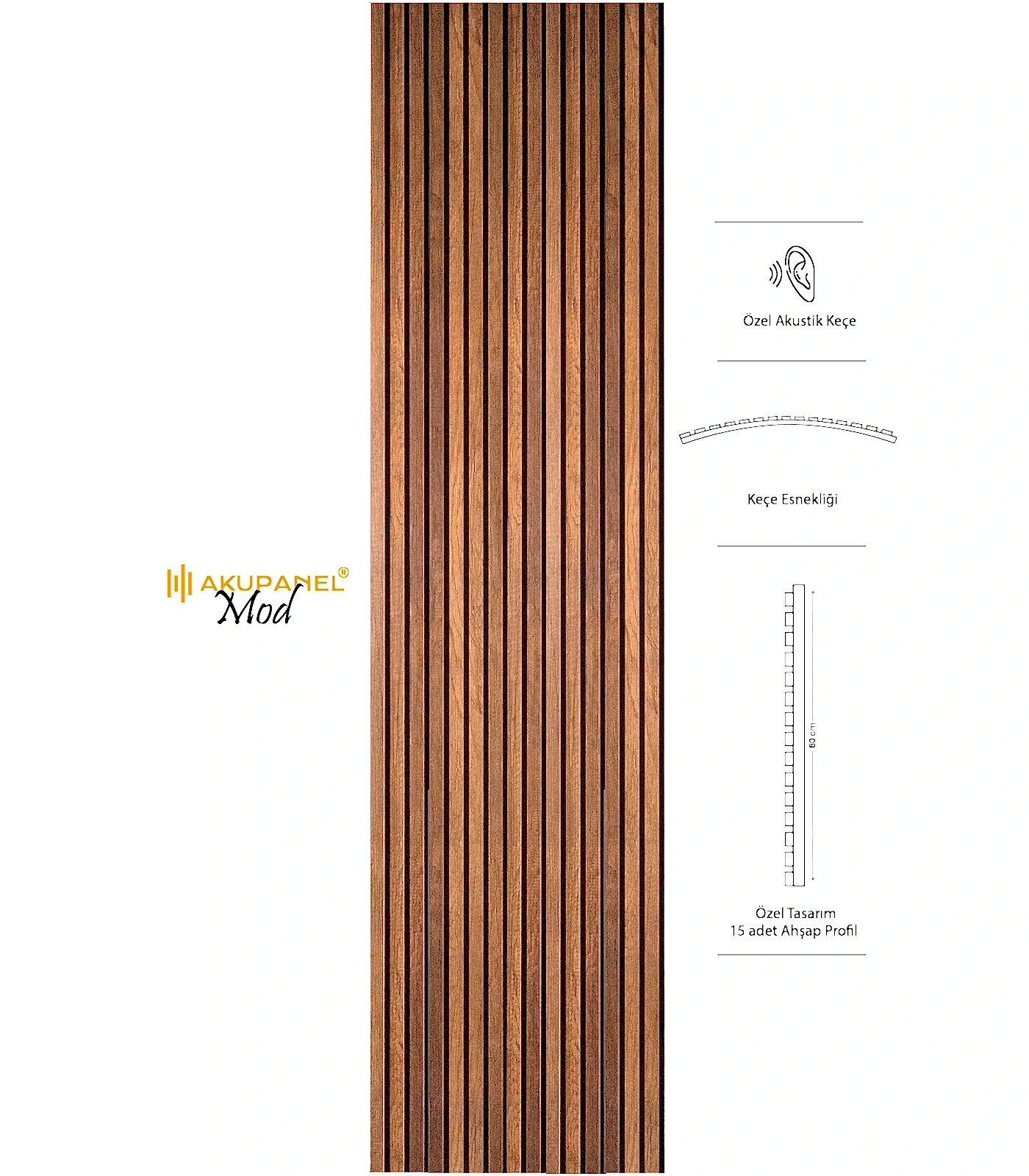 Akupanel, akustik ve dekorasyonu bir araya getiren inovasyon ürünüdür. Bir akupanel ölçülerimiz 60×245 cm dir. Bir akupanel ahşap duvar panelinde 15 adet ahşap profil bulunmaktadır. Ahşap duvar profilleri özel olarak üretilmiş sertifikalı akustik keçe üzerine montajı yapılmıştır. Akupanel’in derinliği 14 mm dir. Oldukça hafif ve eğimli duvarları saracak şekilde esnek bir yapıya sahiptir. Kendin yap deneyimi ile sadece 3 adımda duvara kolayca montajını yapabilirsiniz.