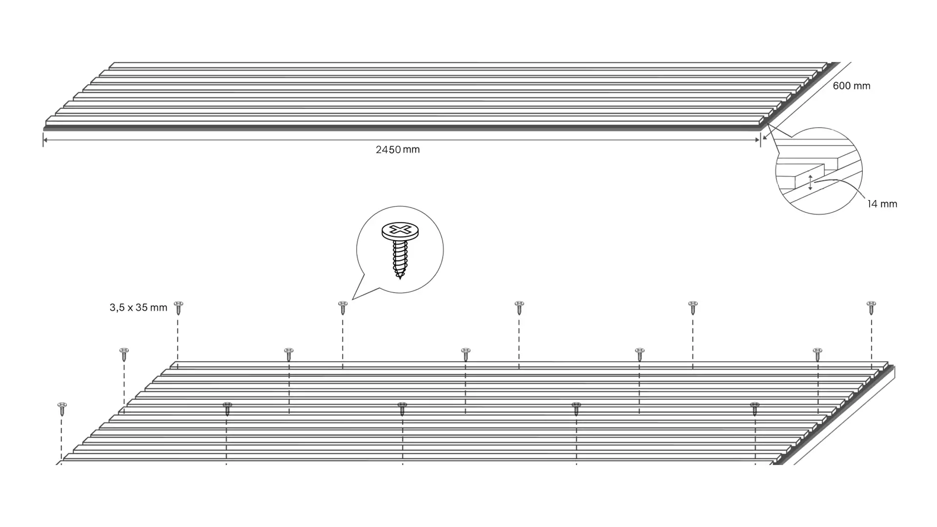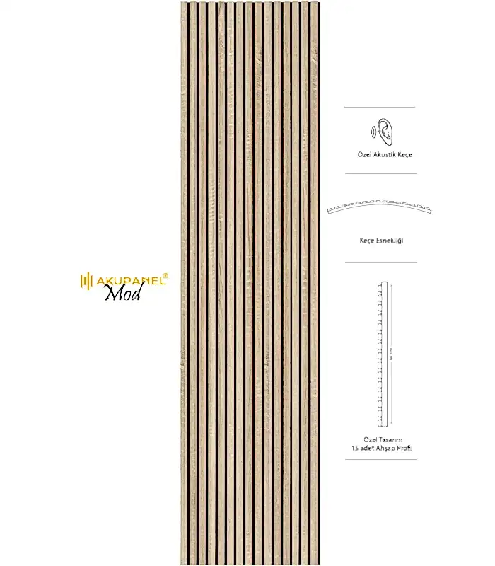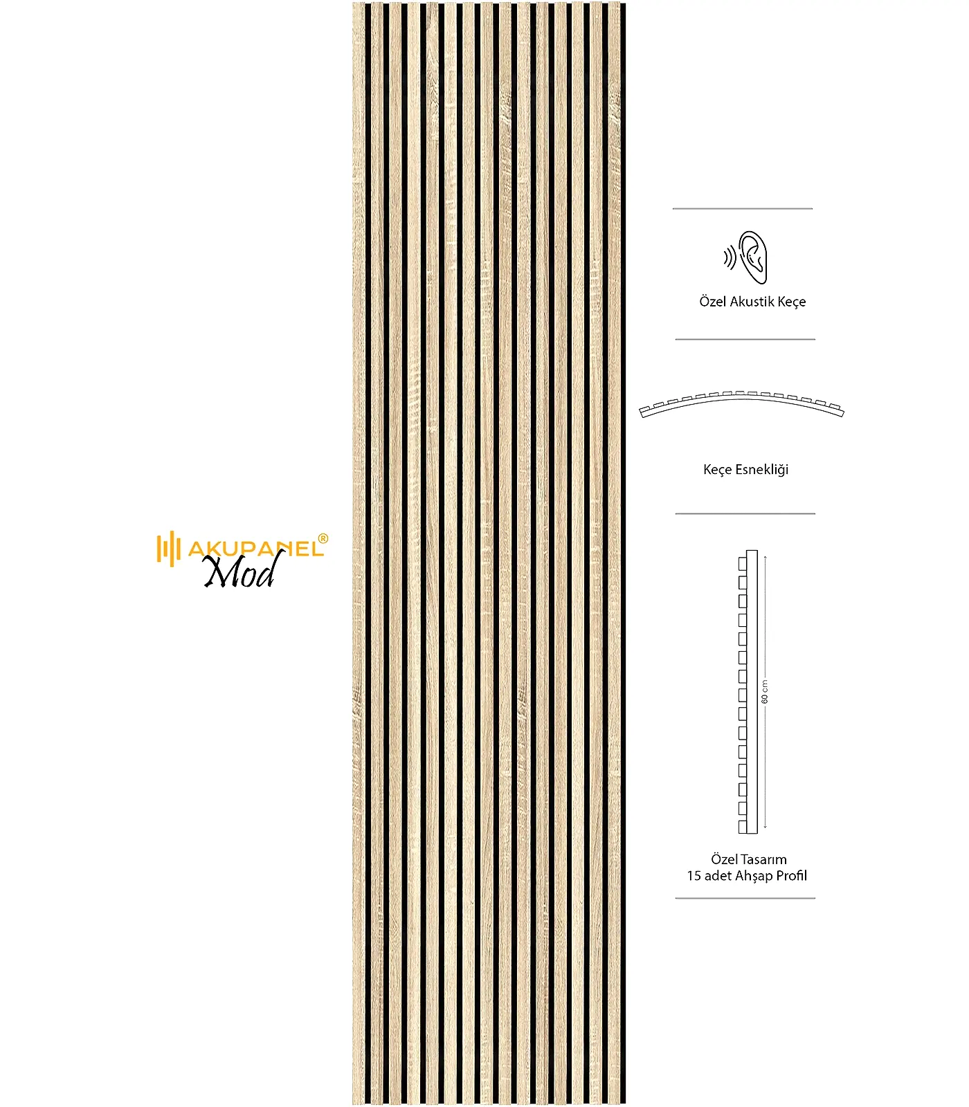 Akupanel, akustik ve dekorasyonu bir araya getiren inovasyon ürünüdür. Bir akupanel ölçülerimiz 60×245 cm dir. Bir akupanel ahşap duvar panelinde 15 adet ahşap profil bulunmaktadır. Ahşap duvar profilleri özel olarak üretilmiş sertifikalı akustik keçe üzerine montajı yapılmıştır. Akupanel’in derinliği 14 mm dir. Oldukça hafif ve eğimli duvarları saracak şekilde esnek bir yapıya sahiptir. Kendin yap deneyimi ile sadece 3 adımda duvara kolayca montajını yapabilirsiniz.