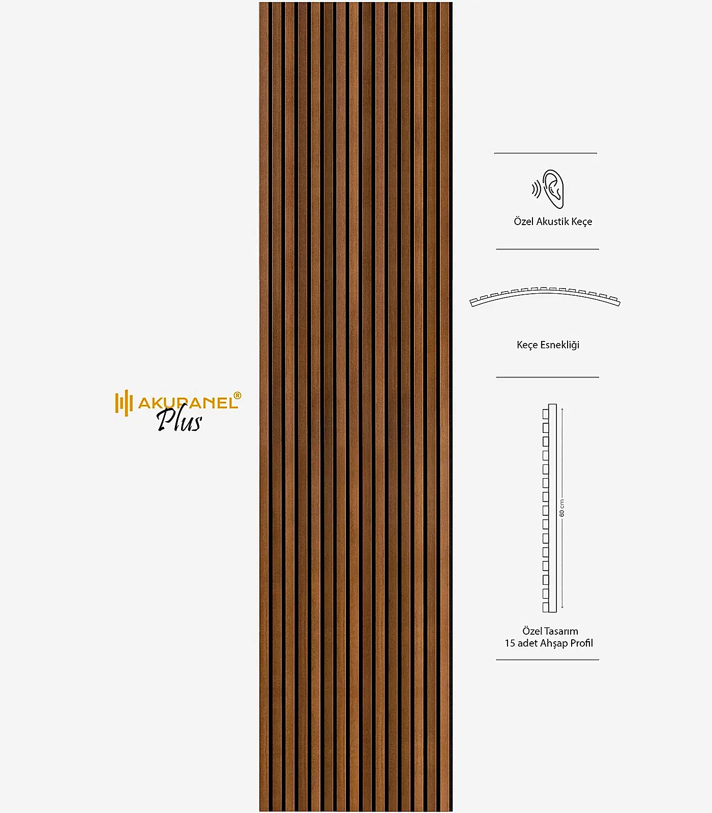 Akupanel, akustik ve dekorasyonu bir araya getiren inovasyon ürünüdür. Bir akupanel ölçülerimiz 60×245 cm dir. Bir akupanel ahşap duvar panelinde 15 adet ahşap profil bulunmaktadır. Ahşap duvar profilleri özel olarak üretilmiş sertifikalı akustik keçe üzerine montajı yapılmıştır. Akupanel’in derinliği 16 mm dir. Oldukça hafif ve eğimli duvarları saracak şekilde esnek bir yapıya sahiptir. Kendin yap deneyimi ile sadece 3 adımda duvara kolayca montajını yapabilirsiniz.