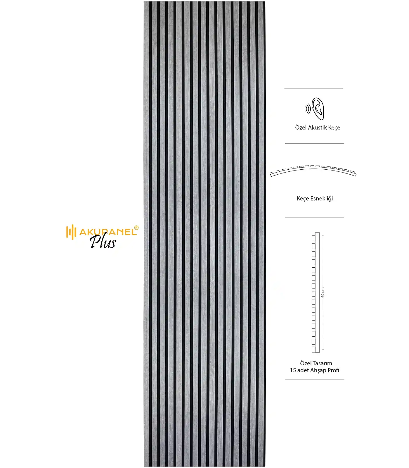 Akupanel, akustik ve dekorasyonu bir araya getiren inovasyon ürünüdür. Bir akupanel ölçülerimiz 60×245 cm dir. Bir akupanel ahşap duvar panelinde 15 adet ahşap profil bulunmaktadır. Ahşap duvar profilleri özel olarak üretilmiş sertifikalı akustik keçe üzerine montajı yapılmıştır. Akupanel’in derinliği 16 mm dir. Oldukça hafif ve eğimli duvarları saracak şekilde esnek bir yapıya sahiptir. Kendin yap deneyimi ile sadece 3 adımda duvara kolayca montajını yapabilirsiniz.