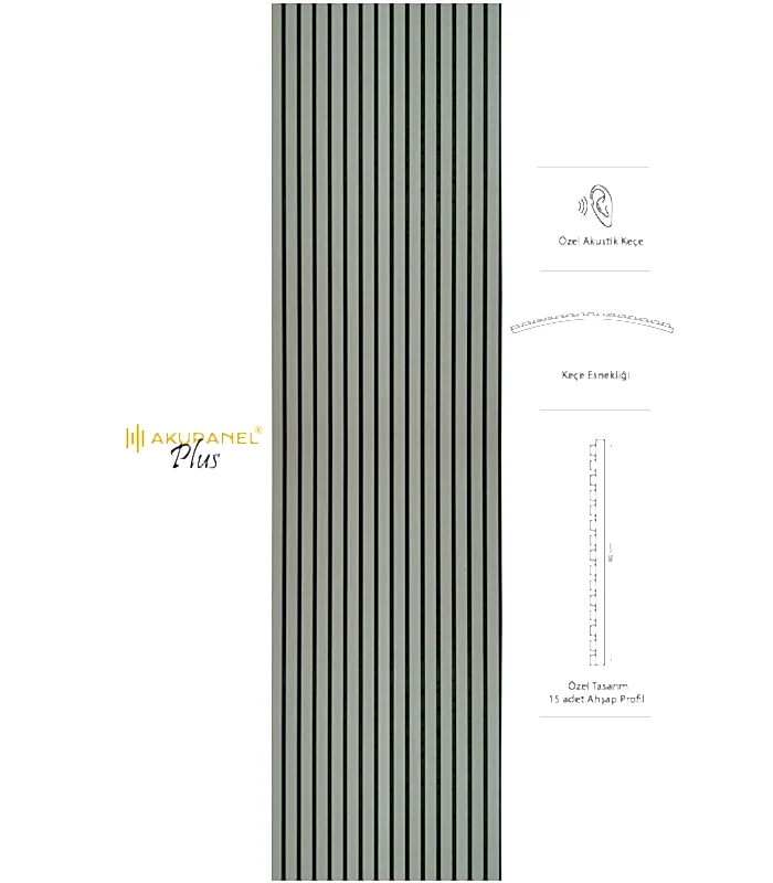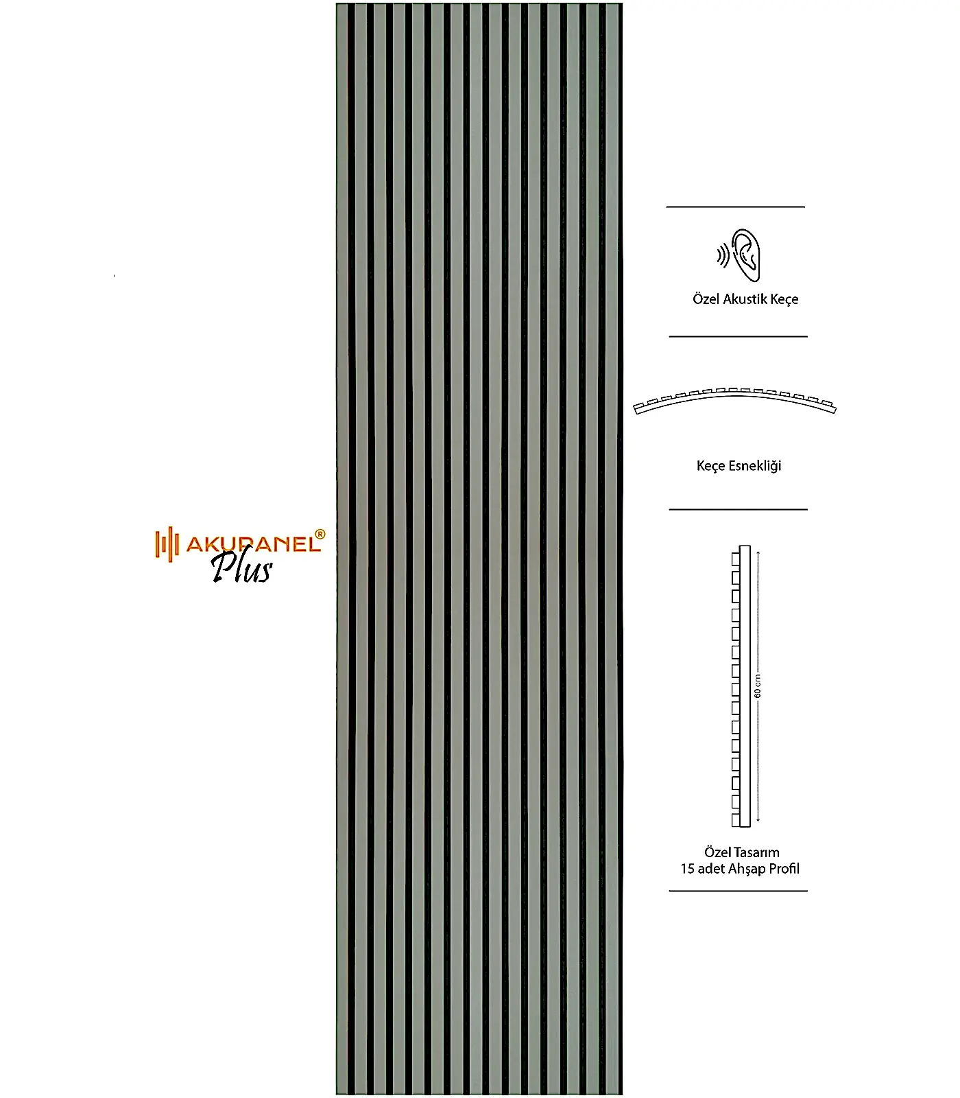Akupanel, akustik ve dekorasyonu bir araya getiren inovasyon ürünüdür. Bir akupanel ölçülerimiz 60×245 cm dir. Bir akupanel ahşap duvar panelinde 15 adet ahşap profil bulunmaktadır. Ahşap duvar profilleri özel olarak üretilmiş sertifikalı akustik keçe üzerine montajı yapılmıştır. Akupanel’in derinliği 16 mm dir. Oldukça hafif ve eğimli duvarları saracak şekilde esnek bir yapıya sahiptir. Kendin yap deneyimi ile sadece 3 adımda duvara kolayca montajını yapabilirsiniz.