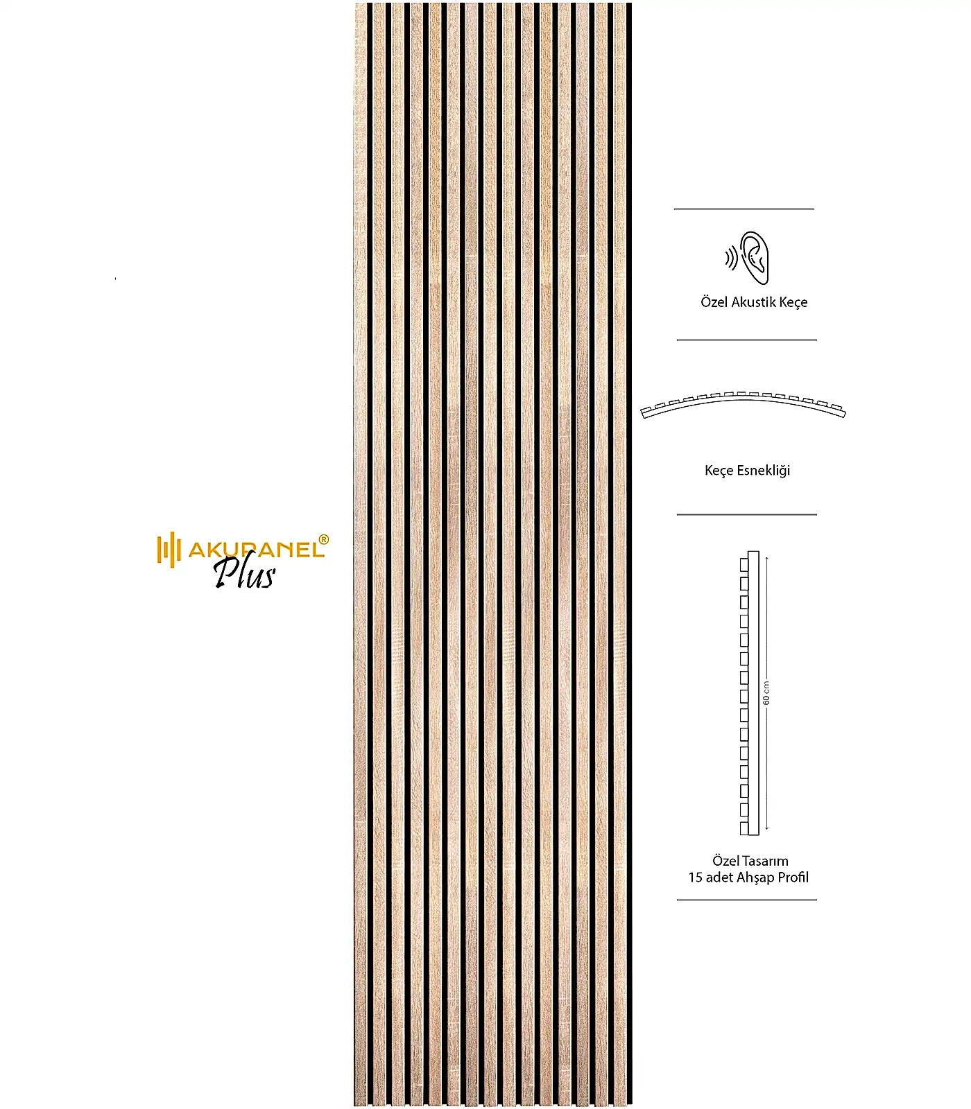 Akupanel, akustik ve dekorasyonu bir araya getiren inovasyon ürünüdür. Bir akupanel ölçülerimiz 60×245 cm dir. Bir akupanel ahşap duvar panelinde 15 adet ahşap profil bulunmaktadır. Ahşap duvar profilleri özel olarak üretilmiş sertifikalı akustik keçe üzerine montajı yapılmıştır. Akupanel’in derinliği 16 mm dir. Oldukça hafif ve eğimli duvarları saracak şekilde esnek bir yapıya sahiptir. Kendin yap deneyimi ile sadece 3 adımda duvara kolayca montajını yapabilirsiniz.