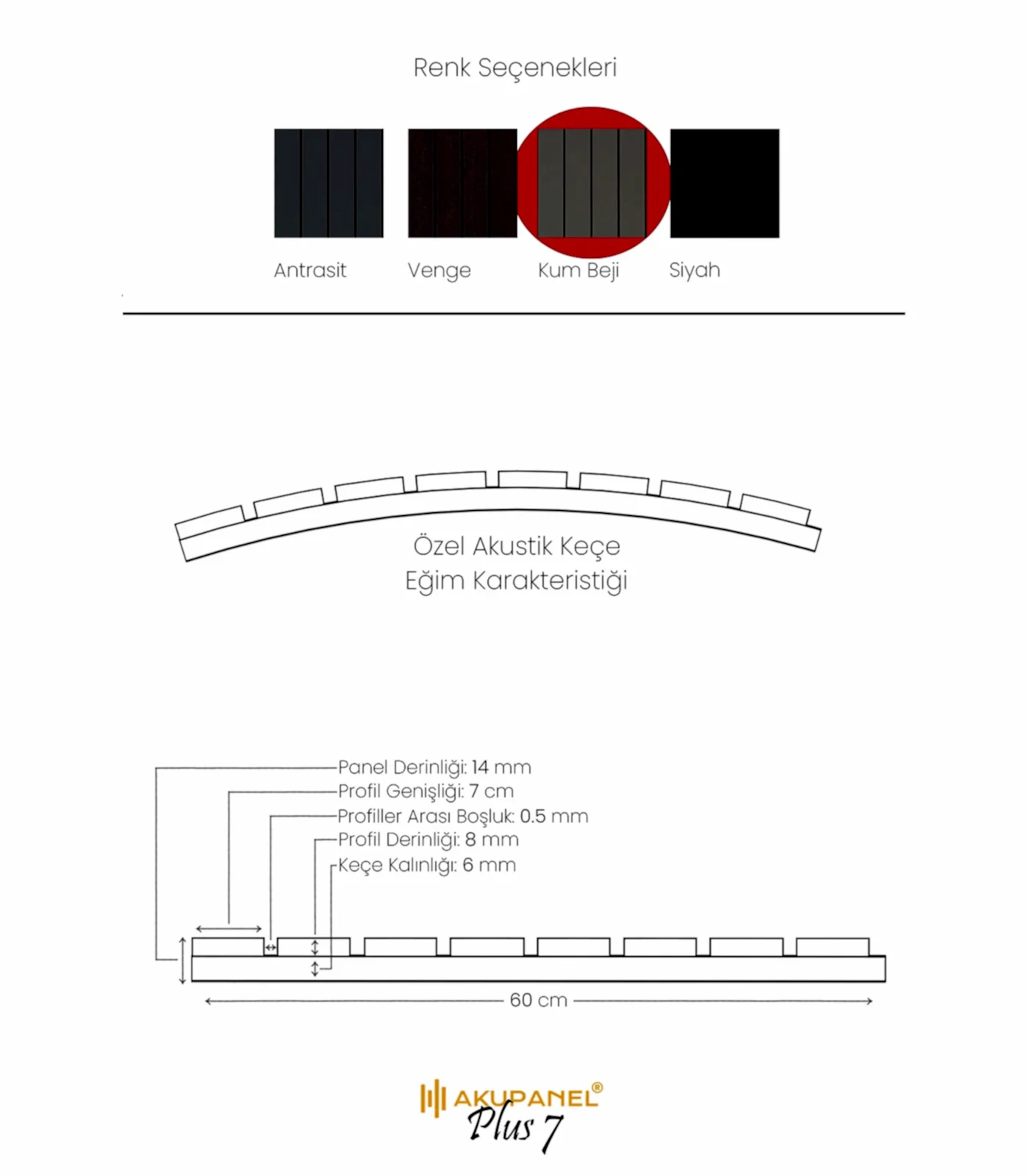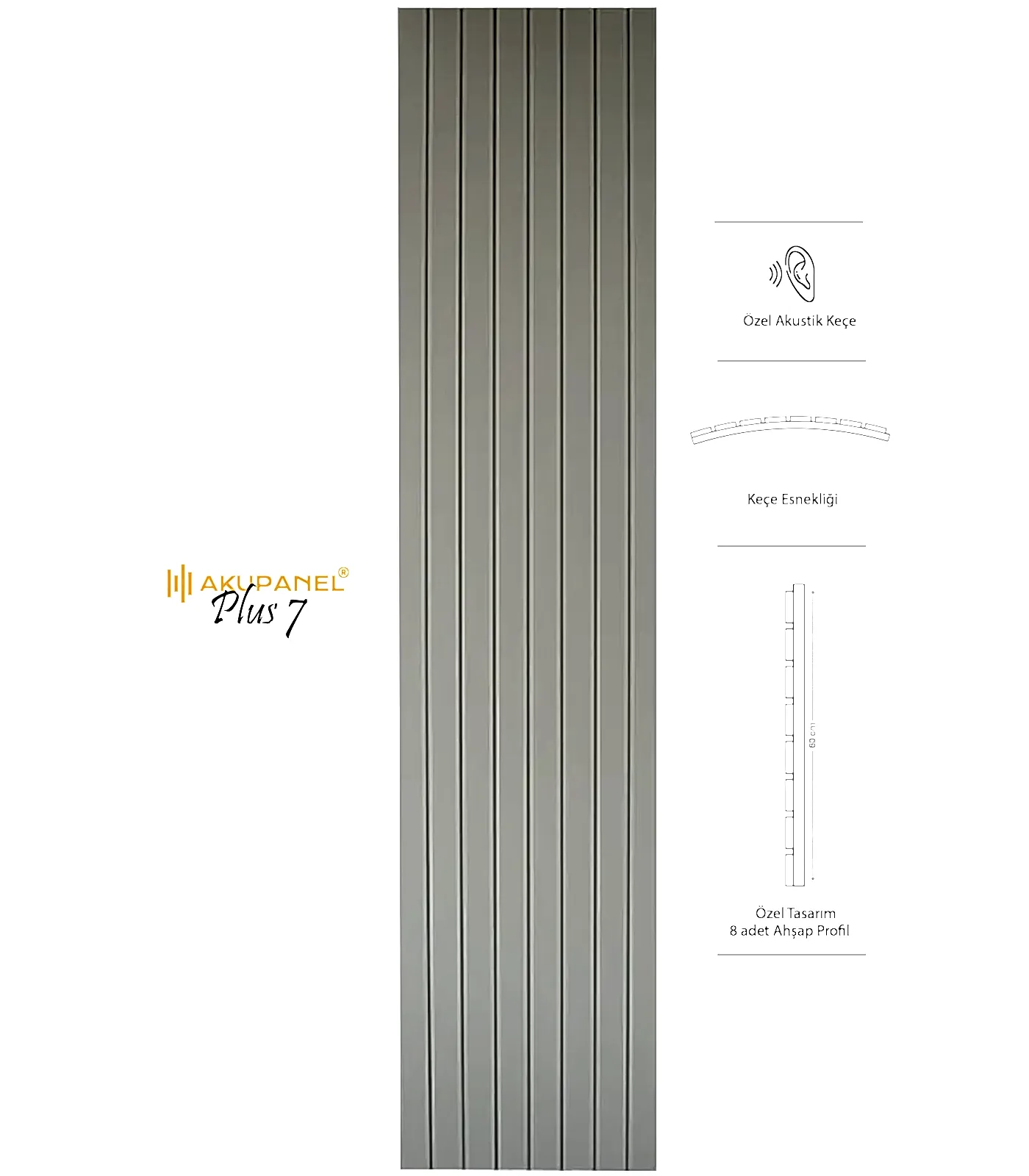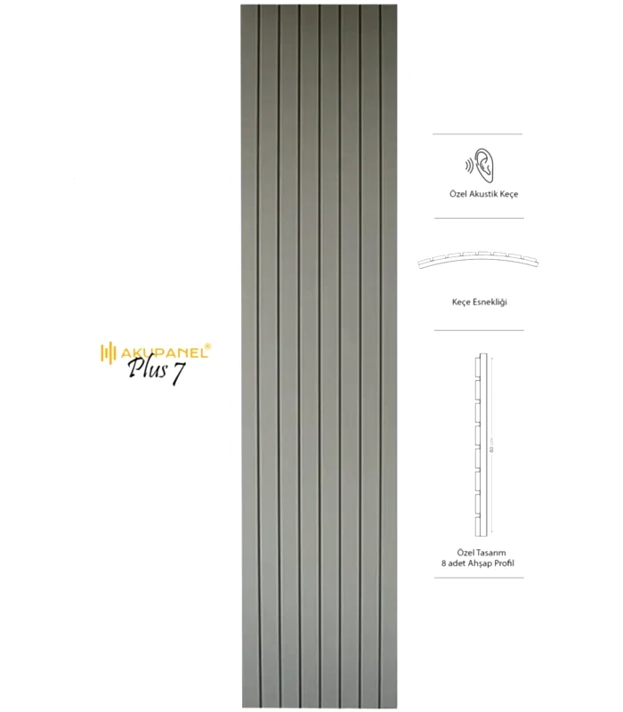 Akupanel, akustik ve dekorasyonu bir araya getiren inovasyon ürünüdür. Bir akupanel ölçülerimiz 60×245 cm dir. Bir akupanel ahşap duvar panelinde 8 adet ahşap profil bulunmaktadır. Ahşap duvar profilleri özel olarak üretilmiş sertifikalı akustik keçe üzerine montajı yapılmıştır. Akupanel’in derinliği 16 mm dir. Oldukça hafif ve eğimli duvarları saracak şekilde esnek bir yapıya sahiptir. Kendin yap deneyimi ile sadece 3 adımda duvara kolayca montajını yapabilirsiniz.